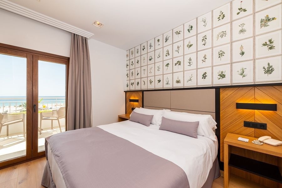 Nuestro hotel tiene un toque a casa de pueblo, luminosa, con paredes blancas y toques de madera. Estamos en primera línea de playa. Además de las habitaciones para 2, contamos con habitaciones para 4 personas, perfectas para acudir en familia, con varios dormitorios, uno para los niños y otra para vosotros, para que podáis dormir tranquilos.