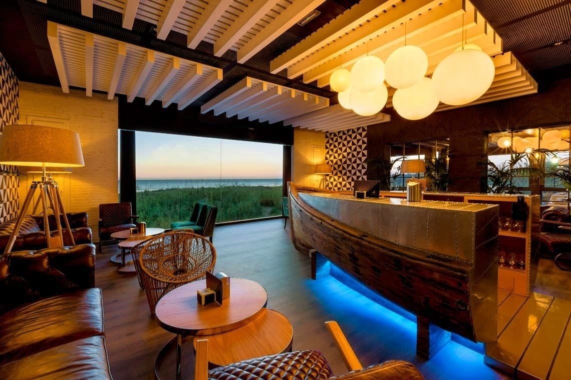 El atrio de entrada al hotel tiene una gran claraboya por donde entra la luz. Pepe Herrera, que lo diseñó en 1999 revistió las paredes en un verde que recuerda al mar. Para el suelo mármoles relajantes. Paredes claras en las habitaciones para reflejar la luz que entra por las terrazas, que tienen todas las habitaciones, la mayoría con vistas al mar.